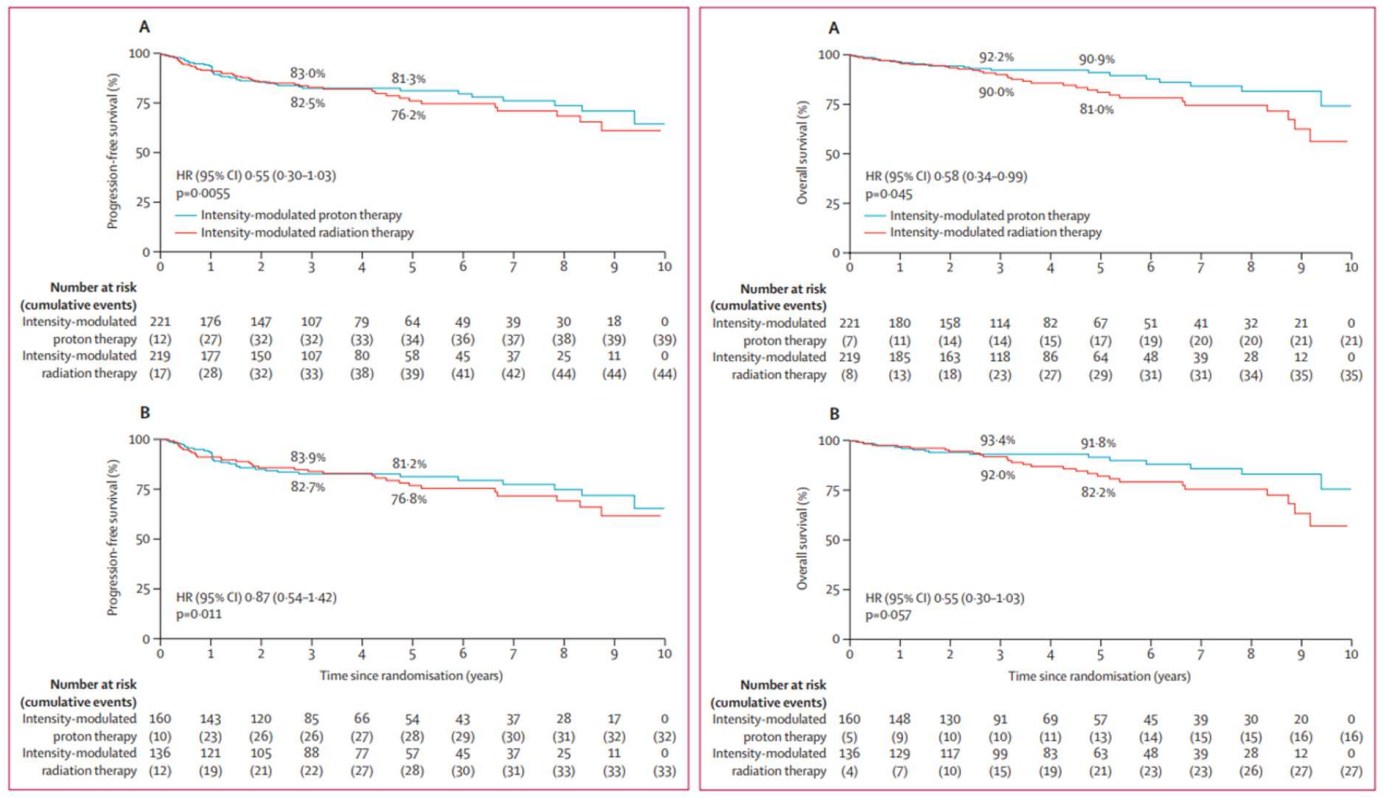 Cet essai multicentrique randomisé de phase 3 (21 centres américains, octobre 2013-mai 2022) a inclus 440 patients (âge médian 61 ans, 91 % hommes, 95 % p16-positifs) avec cancer de l'oropharynx stade III-IVB, randomisés 1:1 IMPT vs IMRT. Le critère principal était la survie sans progression avec une marge de non-infériorité de 9% à 3 ans.